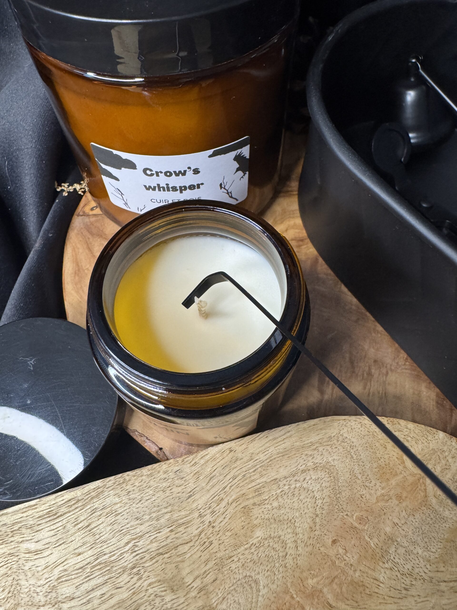 - d’une cloche permettant l’extinction de la mèche plus sainement en limitant la fumée.